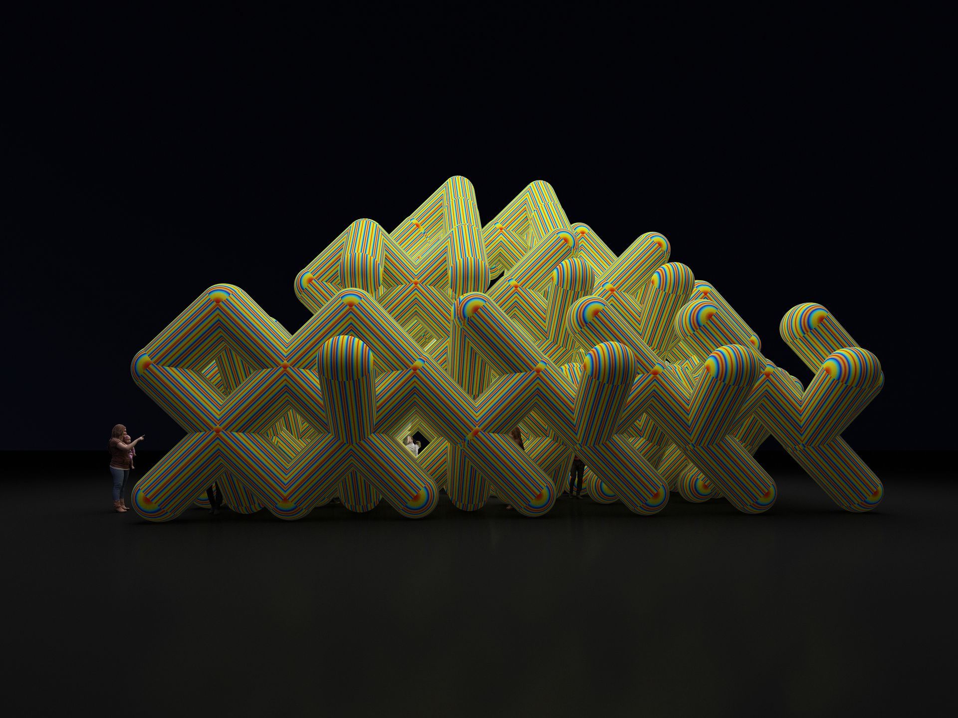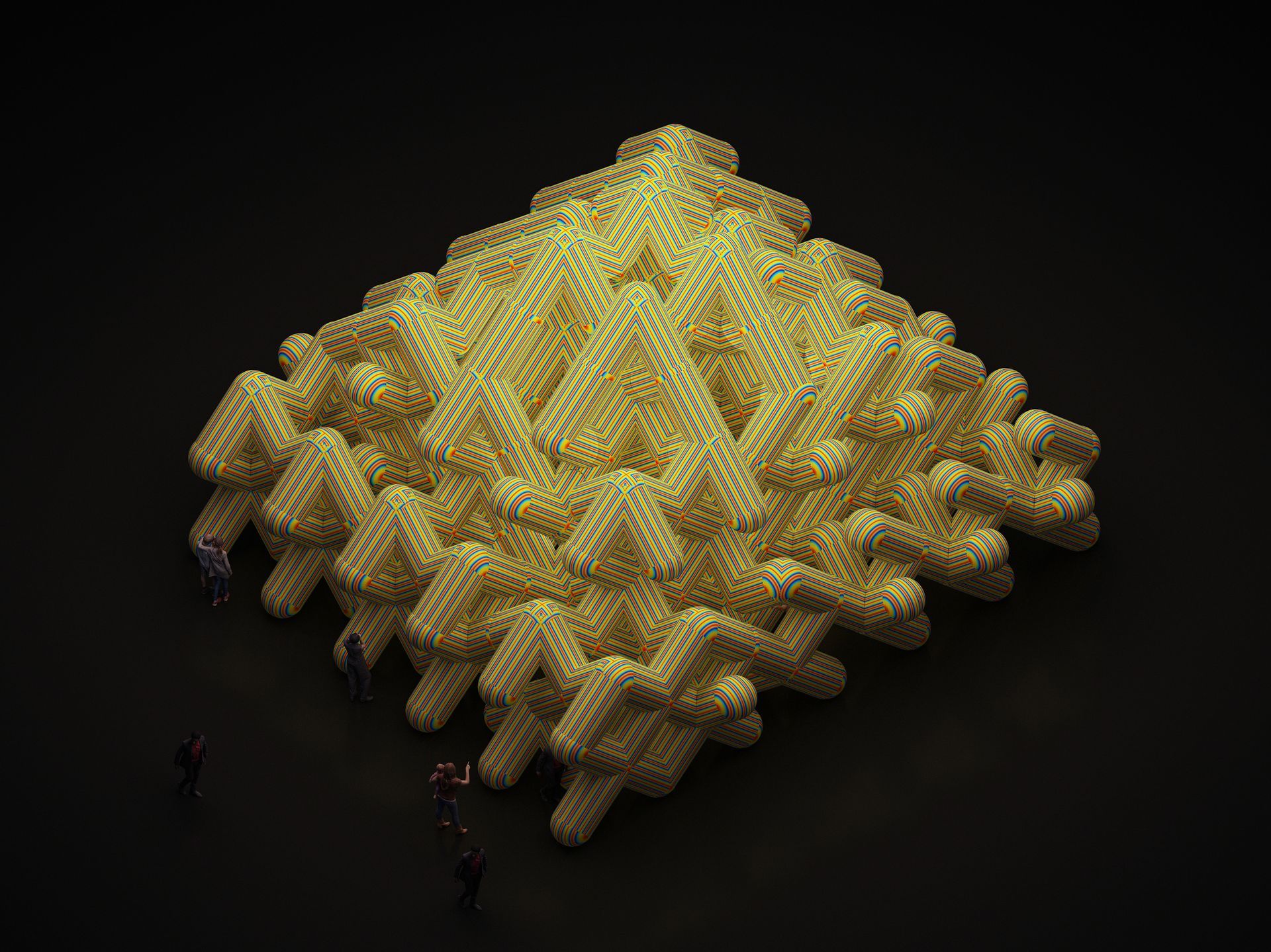 Drawing on the pyramid’s long-standing symbolism of stability and balance, the work reimagines the form as soft, temporary, and immersive—inviting audiences to step inside these storey-high grid inspired structures. The installations are positioned next to the modernist lines of the TD Centre, designed by Mies van der Rohe, and Eberhardt Zeidler's CF Toronto Eaton Centre, creating a striking contrast between the brilliantly coloured pyramids and the surrounding dark steel-and-glass architecture.